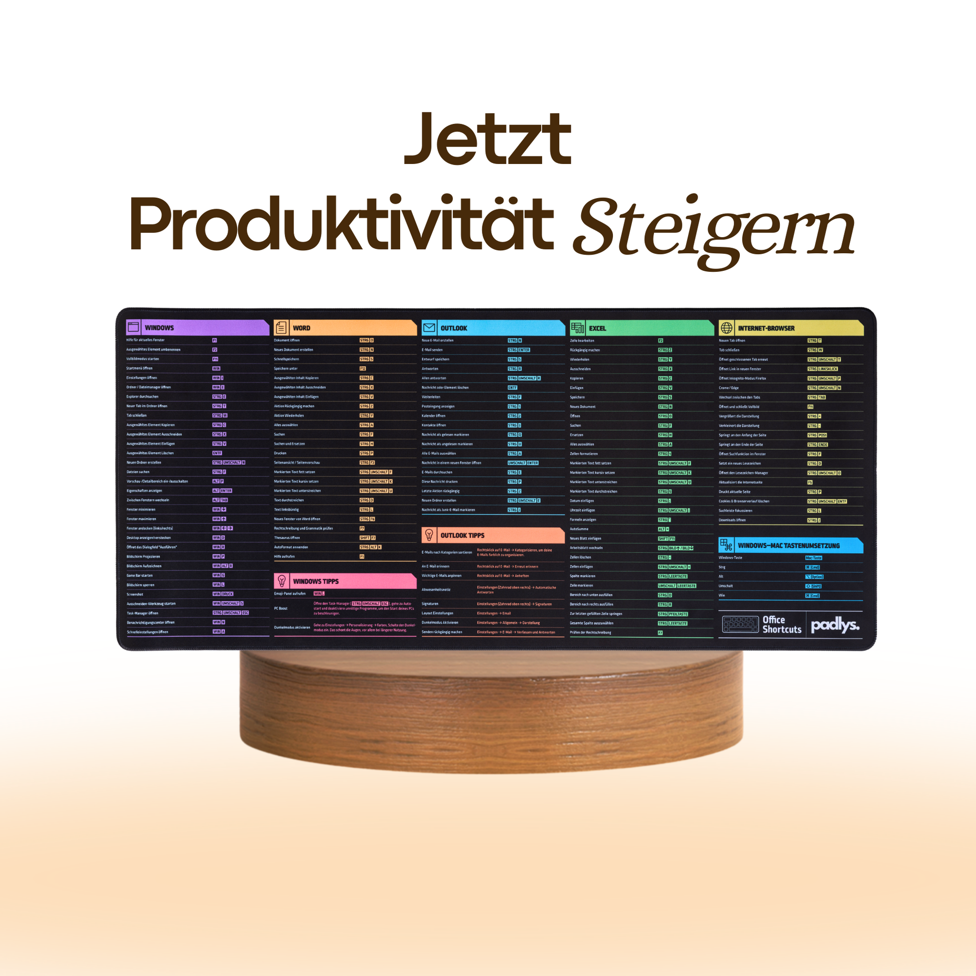 Schluss mit der ewigen Suche nach Tastenkombinationen: Mit dem Office Mauspad Deutsch von Padlys® hast du die wichtigsten Shortcuts für Microsoft Office Programme wie Excel, Word, Outlook, Windows und Browser jederzeit im Blick. Ob im Büro, Homeoffice oder Studium – dieses Office Shortcut Mauspad bringt dir Geschwindigkeit, Übersicht und Struktur direkt auf den Schreibtisch.